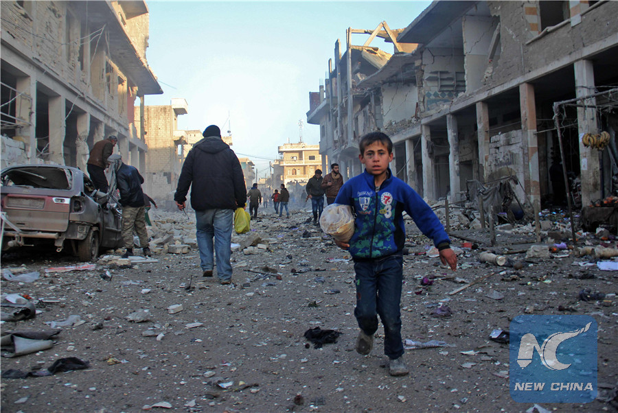 A Syrian boy runs while carrying bread following a reported airstrike by government forces, in the Syrian town of Binnish, on the outskirts of Idlib, on January 12, 2017. (AFP/Xinhua)