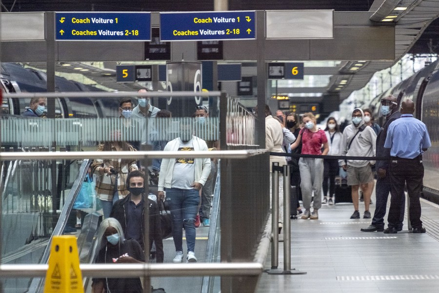 Passengers from France by Eurostar arrive at St. Pancras International Station in London, Britain on Aug. 15, 2020. People arriving in Britain from France, the Netherlands, Monaco, and Malta after 04:00 BST (0300 GMT) on Saturday will have to self-isolate for 14 days in an effort to check the spread of coronavirus, British Transport Secretary Grant Shapps announced on Aug. 13. (Xinhua)