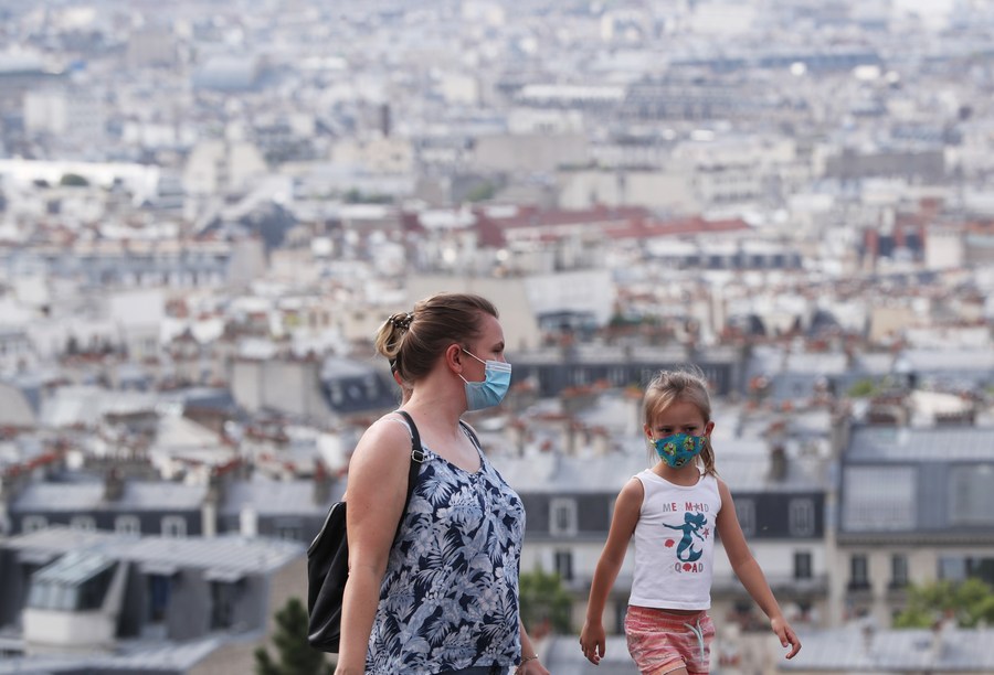People wearing masks visit the Montmartre in Paris, France, Aug. 10, 2020. Masks are compulsory for people aged 11 and over in crowded areas in Paris and its surrounding areas, including tourist sites, open markets, areas around stations, banks of the Seine and of Canal Saint-Martin and other places in Paris where social distancing is difficult. (Xinhua/Gao Jing)
