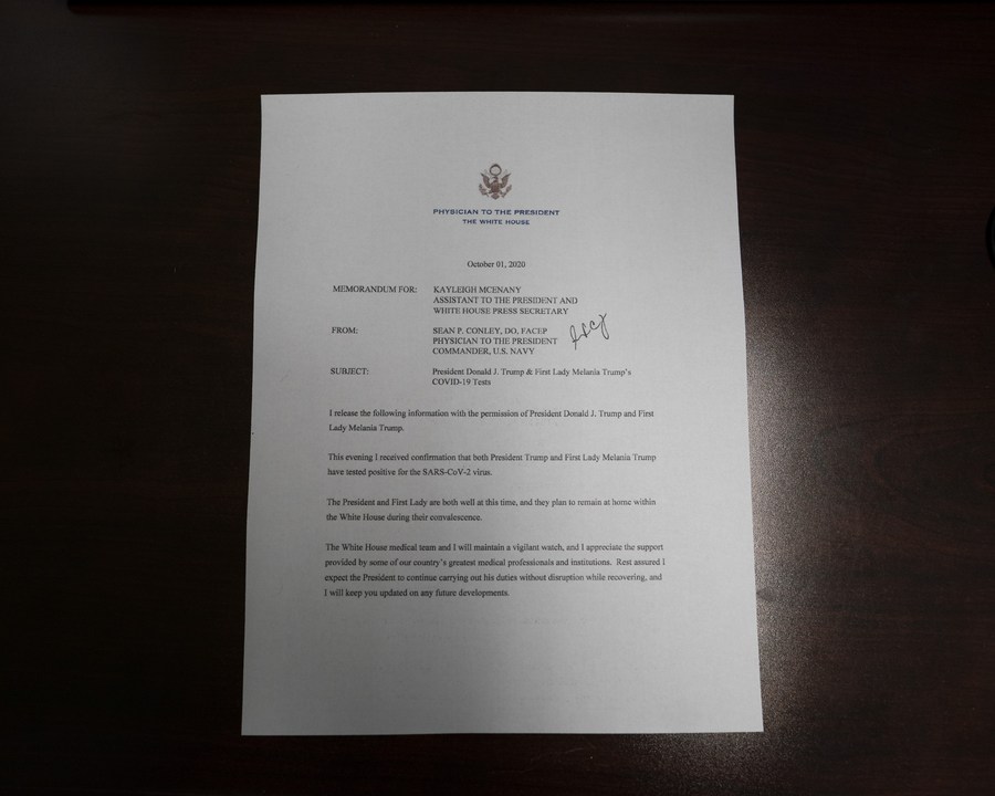 Photo taken on Oct. 2, 2020 shows a print copy of a memorandum from the U.S. President's physician Sean Conley in Washington, D.C., the United States. (Xinhua/Liu Jie)