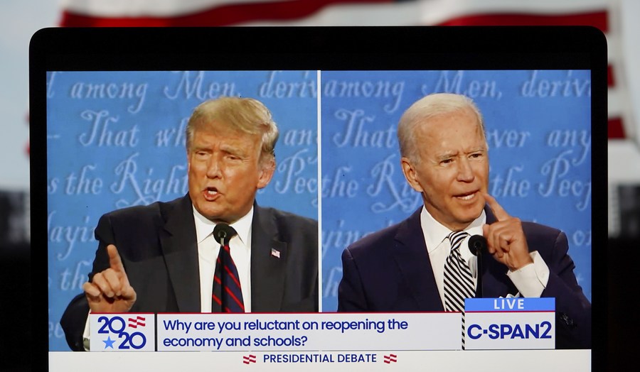 Photo taken in Arlington, Virginia, the United States on Sept. 29, 2020 shows C-SPAN 2 live stream of U.S. President Donald Trump (L) and his Democratic challenger Joe Biden speaking during their first debate in the 2020 presidential race. (Xinhua/Liu Jie)