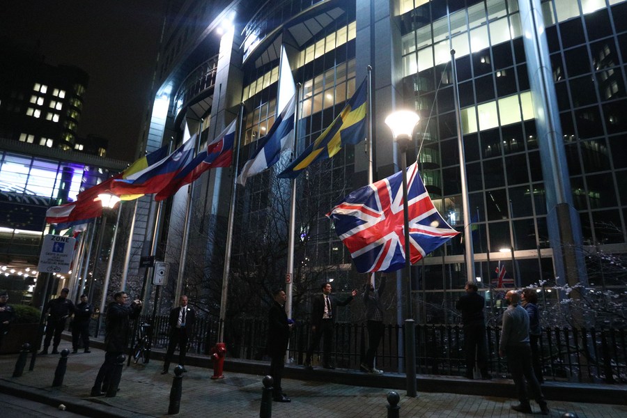 The British national flag is lowered down outside the European Parliament in Brussels, Belgium, on Jan. 31, 2020. The United Kingdom's withdrawal agreement will enter into force upon the UK's exit from the EU on Friday night, ending the country's 47-year membership. (Xinhua/Zheng Huansong)