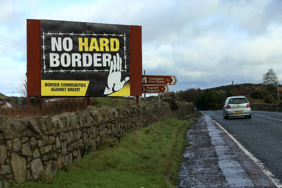 A vehicle moves past a billboard in Jonesborough, Northern Ireland, the United Kingdom, on Jan. 31, 2020. The United Kingdom will leave the European Union (EU) on Jan. 31, 2020. (Photo by Paul McErlane/Xinhua)