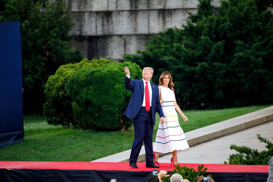 U.S. President Donald Trump and first lady Melania Trump arrive at the Independence Day celebration event at the Lincoln Memorial in Washington D.C., the United States, July 4, 2019. (Xinhua/Ting Shen)