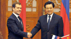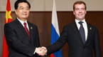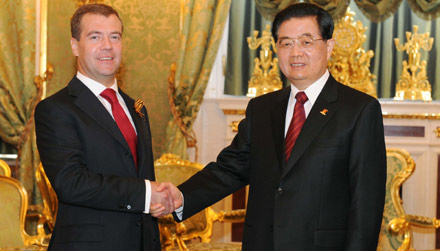 Chinese President Hu Jintao and his Russian counterpart Dmitry Medvedev met in Moscow on Sunday to discuss ways to strengthen their bilateral strategic relations of cooperation and partnership.