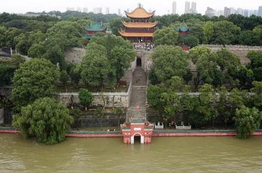 上漲的江水已淹到漢口江灘一級親水平臺(7月13日攝,無人機照片)。當日17時,長江幹流漢口站水位達28.74米,較之前的洪峰水位28.77米出現輕微下降。長江中下遊洪水洪峰順利通過漢口江段。 新華社記者 肖藝九 攝