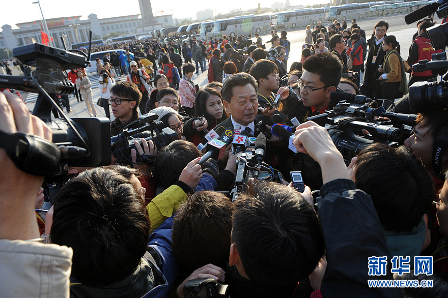 11月8日,中國共産黨第十八次全國代表大會在北京人民大會堂開幕。圖為記者圍追堵截採訪出席開幕會的十八大代表。新華網 陳競超 攝