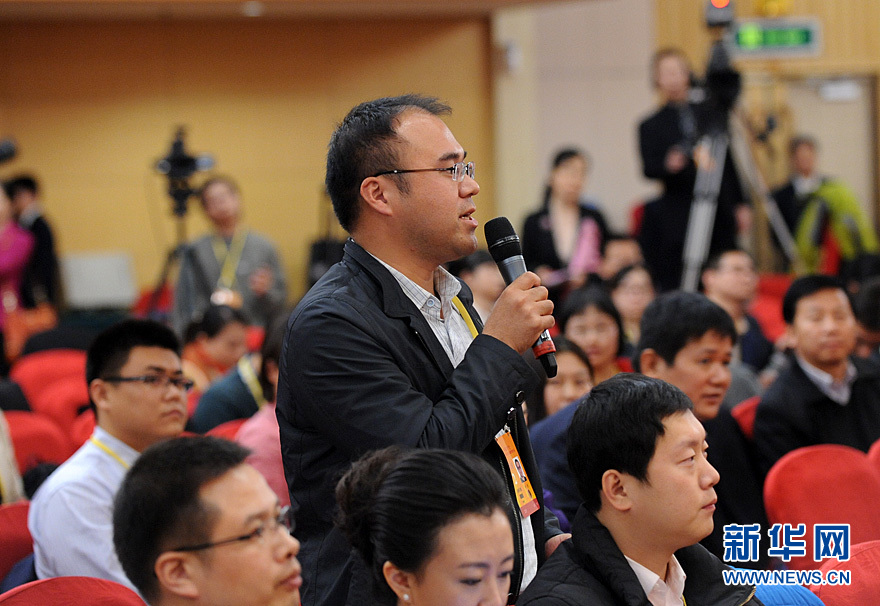 2012年11月12日,十八大新聞中心舉辦主題為“黨組織建設與新形勢新任務”的集體採訪。中鐵電氣化局集團第一工程有限公司接觸網六段高級技師巨曉林,內蒙古自治區阿巴嘎旗薩如拉圖雅嘎查黨支部書記廷·巴特爾,中國科學院上海微係統與信息技術研究所所長、中國科學院院士王曦,陜西省銅川市職業病防治院黨支部副書記、王益區金華社區衛生服務中心康復護理部主任楊瑞輝接受採訪。圖為光明日報記者提問。新華網 陳競超 攝
