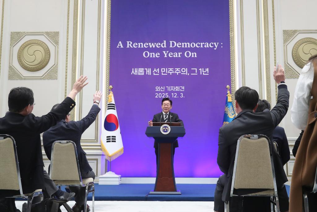 12月3日,在韓國首爾青瓦&迎賓館,韓國總統李在明舉行外媒記者會。