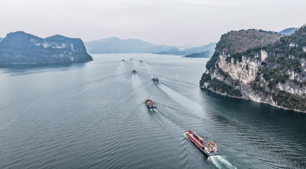 12月16日,隨着汽笛長鳴,橋式起重機將裝有沉澱硫酸鋇的集裝箱吊入貨船準備起運,貴州省首個自動化港口——甕安港雲中港區正式開港。
