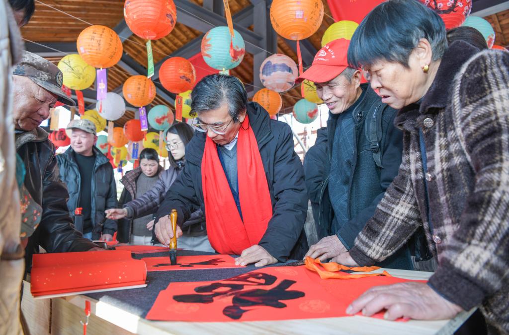 12月28日,書畫愛好者在民俗游園會活動現場給人們寫福字。