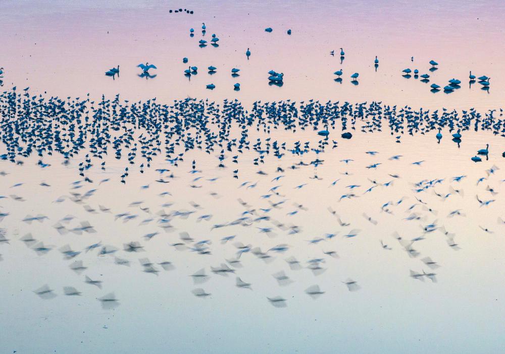 近日,大批候鳥飛抵江蘇省興化市裏下河國家濕地公園,成群結隊在淺灘覓食、休憩。近年來,當地生態環境持續改善,越冬候鳥數量逐年增多。