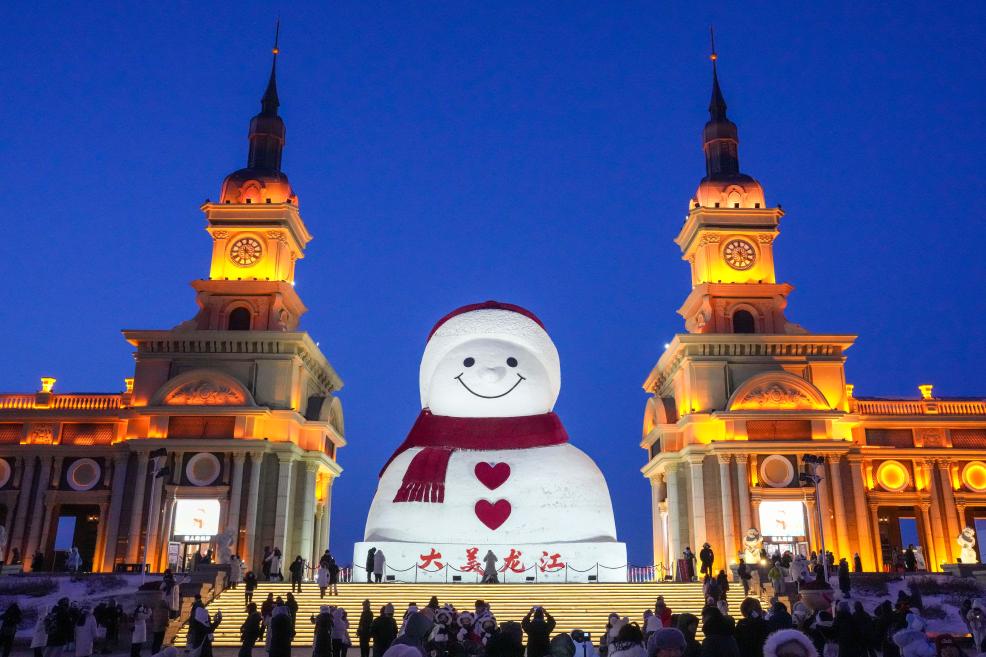 時下,“冰城”哈爾濱市正值冰雪旅游旺季。位於哈爾濱市群力音樂公園的大雪人吸引着眾多游客前來打卡。日落後的藍調時刻,在天光與燈光的交相映照下,大雪人更顯浪漫迷人。