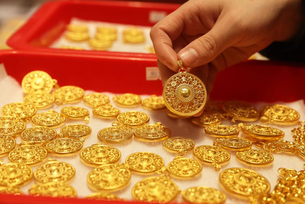1月28日,員工在位於浙江省杭州市蕭山區瓜瀝鎮的杭州航民百泰首飾有限公司展廳整理黃金首飾。