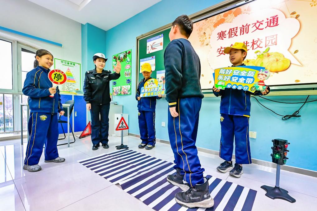 1月28日,天津市公安局濱海分局交通管理支隊民警在天津市海嘉學校帶領學生進行交通模擬體驗。