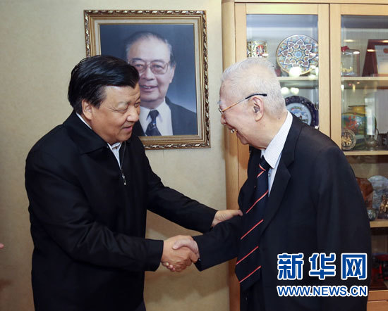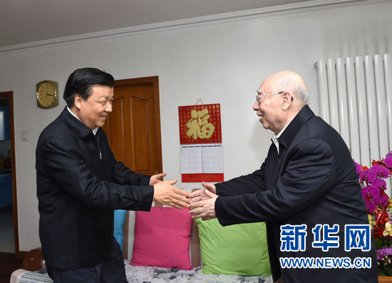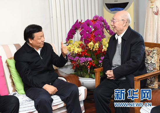 2月11日,中共中央政治局常委、中央書記處書記劉雲山代表習近平總書記和黨中央,登門看望國家最高科技獎獲得者于敏、張存浩,向他們致以誠摯問候,向科技工作者致以新春祝福。這是劉雲山看望我國著名物理化學家、中國科學院院士張存浩。 新華社記者 丁林 攝