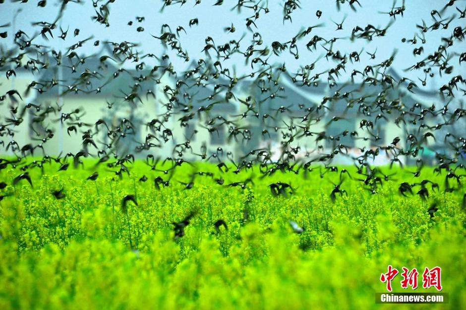 三月以來,湖南安仁縣永樂江鎮新豐村萬畝油菜花海中,數以萬計的小鳥在這裏歡聚梄息,匯融出“鳥語花香”的獨特生態奇觀。中新社發 何超 攝