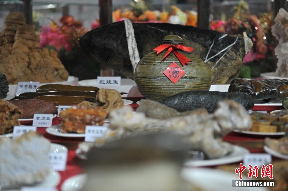 7月10日,中國昆明泛亞石博覽會開幕,來自22個國家和地區的參展商參加了本屆石博會,並現場展示各類精美的珠寶、玉石、觀賞石等。現場展出的“奇石宴”吸引了眾人眼球,由石頭做成的600多道“菜”售價29.8億,號稱“天下第一奇石盛宴”。圖為石博會上展出的“奇石宴”。 中新社發 任東 攝