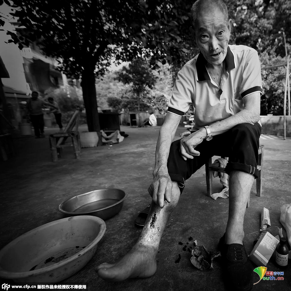 毛三根,八十二歲,常山縣東案鄉馬初村人。“我的腳一爛就是七十多年,爛得最厲害的那幾年,連骨頭都看得到。現在每天用茶水、鹽水泡腳、換藥,一天不洗幹凈,就臭得厲害。”