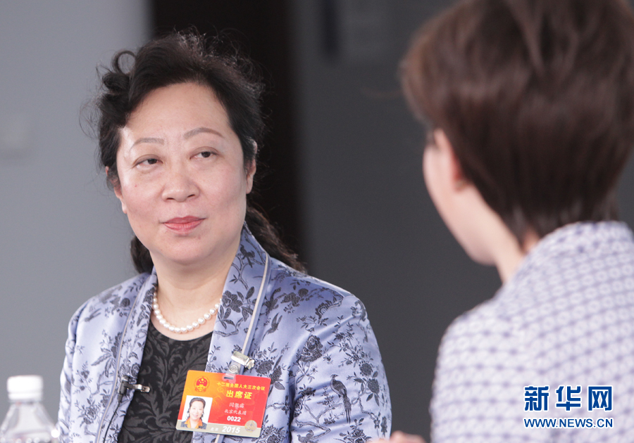 2015年3月4日,全國人大代表、北京市科學技術委員會主任閆傲霜作客新華網,談北京市科委如何推動北京市科技創新發展。圖為嘉賓在與主持人交談。 新華網 郭 研 攝