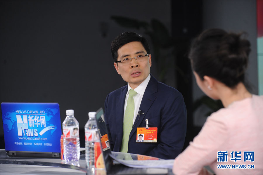 2015年3月7日,全國人大代表,海爾集團輪值總裁周雲傑做客新華網訪談間,談創新創客成為企業發展的新動力。圖為嘉賓與主持人交談。 新華網 陳競超 攝