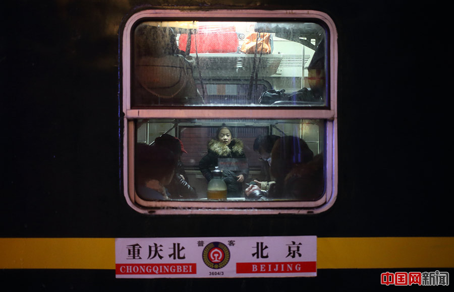 2016年1月23-24日,北京站,3603次列車車窗特寫。24日零時11分,2016年北京春運第一趟加開旅客列車——由北京站開往重慶北的3603次列車發車。中國網記者 陳維松 攝