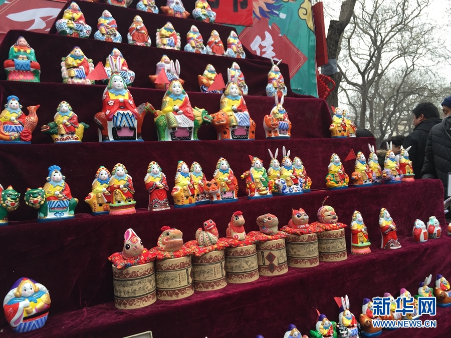廠甸廟會上展示的兔兒爺和各色泥塑(2月11日攝)。 新華網記者 白羽 攝