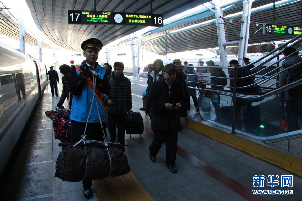 新華網北京2月17日電(記者 熊紅祥)春節期間,鐵路部門擔負著運輸重任,承送各位旅客安全、舒適的至目的地。北京客運段京廣高鐵車隊秉承“三個出行”宗旨,為了協助北京西站運輸保障工作,車隊幹部積極組織備班的動臥三組班組職工,成立志願者組前往站臺引導旅客。