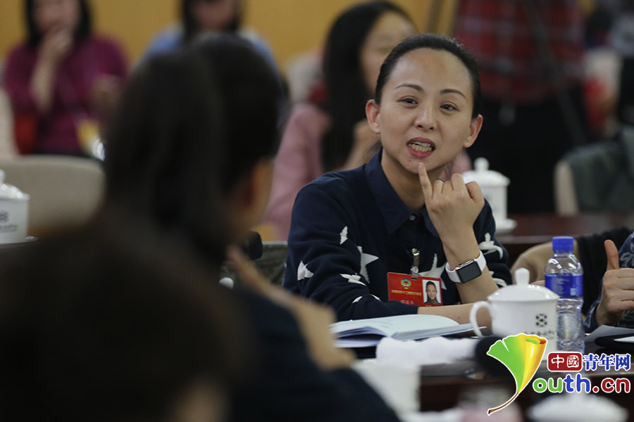3月4日下午,在全國政協文藝26組的小組討論會上,宋祖英熟練地用手語與邰麗華交流。中國青年網記者 張炎良 攝