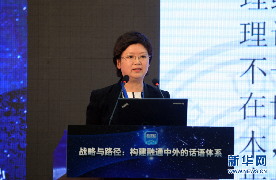 4月7日,新華社國家高端智庫論壇在總社大廈多功能廳舉行。圖為北京大學新聞學院國家戰略傳播研究院院長、博士生導師程曼麗教授發表演講。新華網 陳競超攝