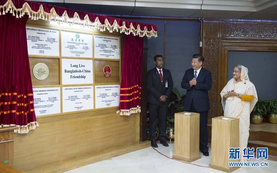 10月14日,國家主席習近平在達卡同孟加拉國總理哈西娜舉行會談。這是會談後,兩國領導人共同出席中孟重大合作項目揭牌儀式。新華社記者謝環馳攝