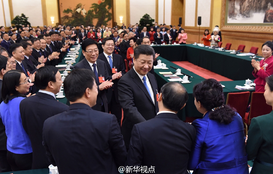 8日上午,習近平參加湖南代表團審議。正值三八國際勞動婦女節,總書記代表黨中央、國務院,向女代表、女委員、女工作人員和全國各族各界婦女致以節日的祝賀和誠摯的祝福。會議結束時,習近平同代表們握手道別。女代表紛紛圍攏過來,向總書記表示感謝。習近平再次向婦女同胞表示祝賀。(新華社記者霍小光,攝影蘭紅光、饒愛民,新華視點微博報道)