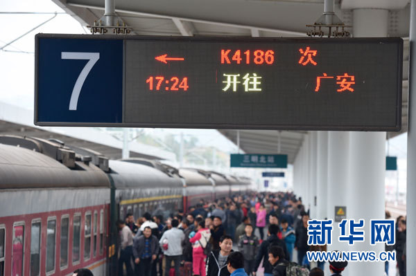 1月13日下午1時58分,福建首趟外來務工人員專列K4186次列車由福州開往四川廣安,2591名外來務工者開始了返鄉旅程。這趟列車途經福建、江西、湖北、陜西、四川5省11站,全程2084公裏,歷時27小時35分鐘。