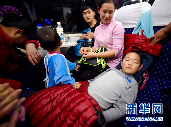 1月13日晚,K4186次外來務工人員專列內,一名小乘客在家人的看護下熟睡。
