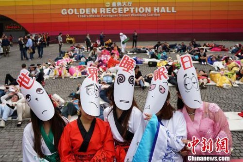 資料圖:重慶某景區工作人員戴著“世界睡眠日”面具。 楊孝勇 攝