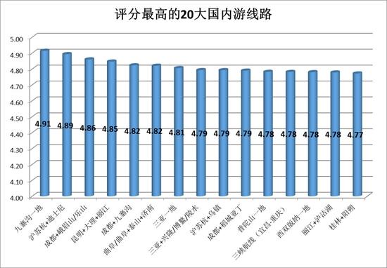全國各地,哪些旅遊線路的評分和滿意度最高?報告發布了“評分最高的20大國內遊線路”,九寨溝一地、滬蘇杭+迪士尼、成都+峨眉山樂山、昆明+大理+麗江、曲阜+泰山+濟南、三亞一地等排名在全國領先。優質線路主要來自四川、雲南、江浙、兩廣、海南等地。這些線路點評分最低也達到4.79分,最高的超過4.9分。
