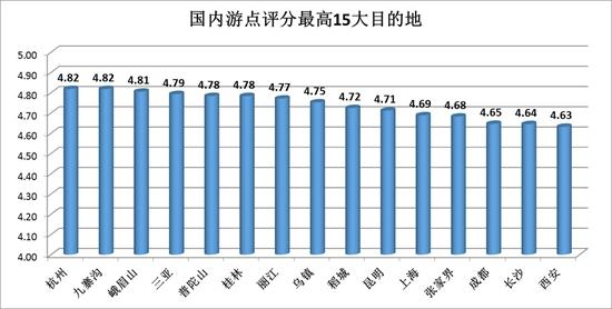國內眾多旅遊城市和目的地中,哪些地方的遊客點評分更高?報告發布了“國內遊點評分最高15大目的地”,依次是:杭州、九寨溝、峨眉山、三亞、普陀山、桂林、麗江、烏鎮、稻城、昆明、上海、張家界、成都、長沙、西安。其中,杭州以4.82分位居第1名。