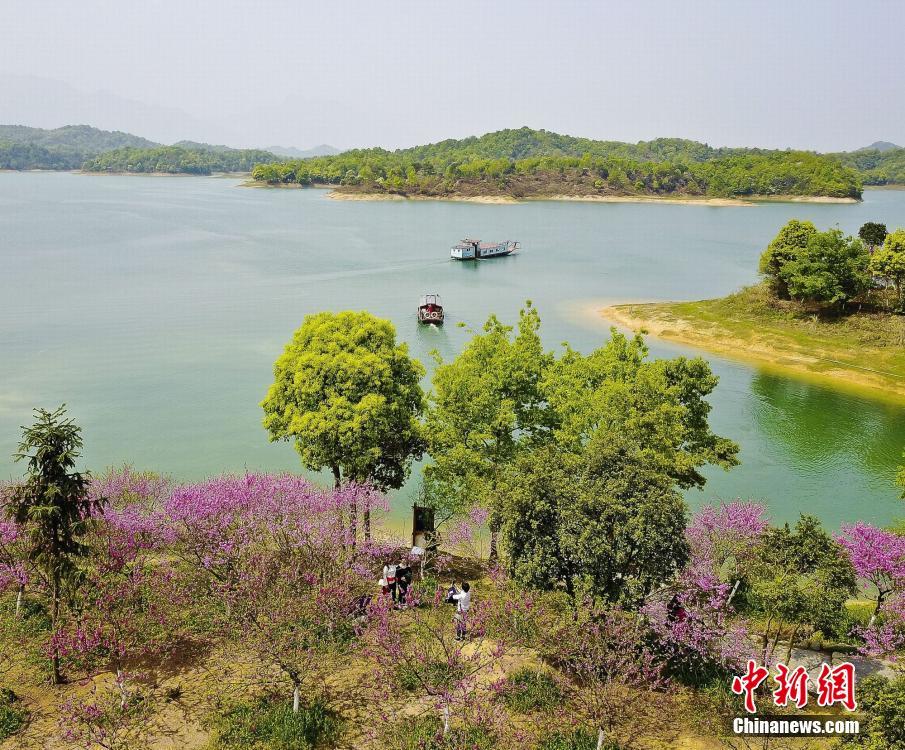 4月8日,江西省九江市武寧縣廬山西海花源谷景區群花盛開。俯瞰花源谷景區,島嶼間桃紅柳綠,一派春意盎然。花源谷景點分別建有“桃花澗”、“櫻花海”、“海棠灣”等十余種觀賞區,形成四季花開、百花爭艷的美麗景象。 楊風勝 攝