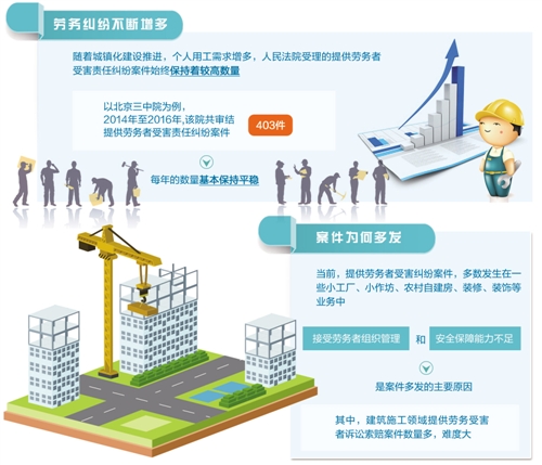 近年來,隨著城鎮化建設推進,個人用工需求增多,人民法院受理的提供勞務者受害責任糾紛案件始終保持著較高數量。以北京三中院為例,2014年至2016年,該院共審結提供勞務者受害責任糾紛案件403件,每年的數量基本保持平穩。