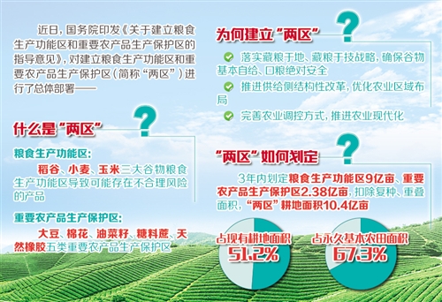 “兩區”具體指什麼?韓長賦解釋説,“兩區”是指糧食生産功能區和重要農産品生産保護區,包括稻谷、小麥、玉米三大谷物糧食生産功能區和大豆、棉花、油菜籽、糖料蔗、天然橡膠等五類重要農産品生産保護區。