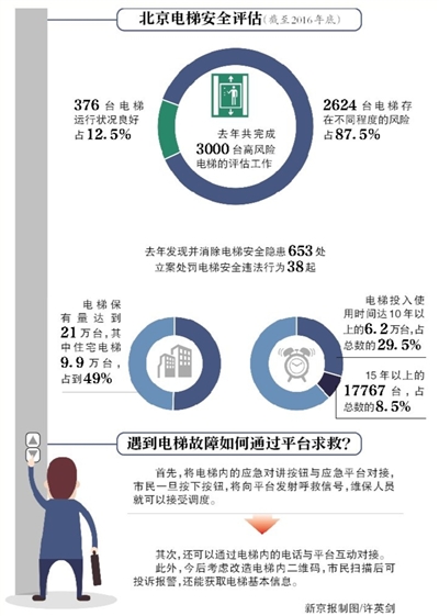 截至去年底,北京電梯保有量達到21萬臺,其中住宅電梯9.9萬臺,佔到49%,投入使用時間超10年的6.2萬臺,佔近三成。今天上午,記者從北京市質量技術監督局獲悉,今年市質監局將對3000臺住宅老舊電梯進行安全評估,此外,在商場、學校等人流密集區域,將試點電梯應急平臺,遇故障可向最近維保人員“派單”。