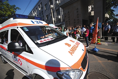 2015年6月7日,一輛120救護車在北京交通大學附屬中學高考考點外待命。新京報資料圖片