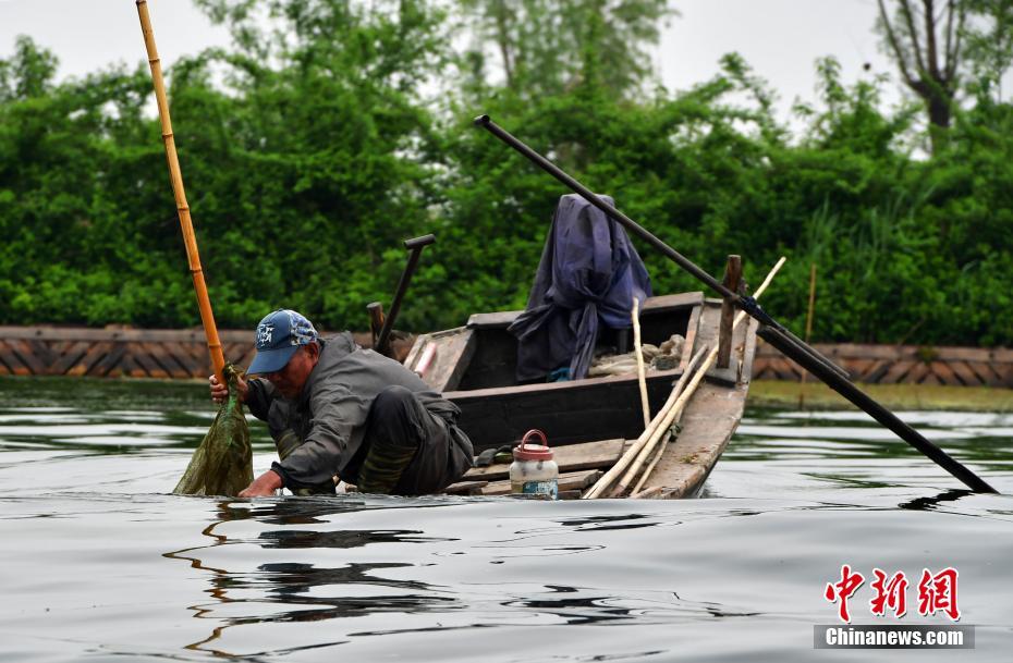 4月16日,雄安新區白洋淀,一位捕魚人正在忙碌。中新社記者 翟羽佳 攝