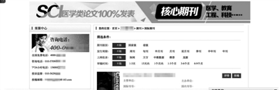 北青報記者發現,目前在網絡上仍有許多自稱可以代發論文給國內外期刊的網站。昨日,北青報記者隨機聯係了其中一家網站,在該網站醫學期刊專欄的顯目位置上,打出了“SCI醫學類論文100%發表”的廣告語。