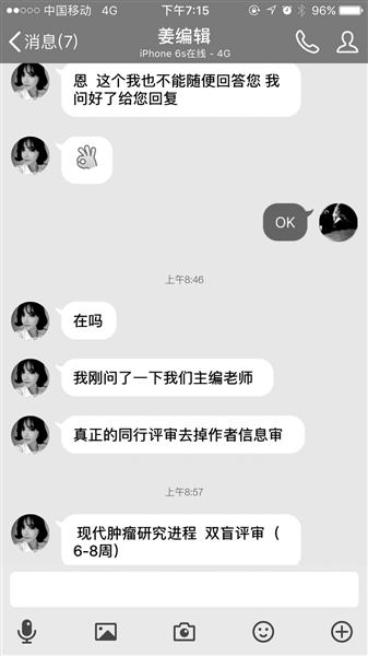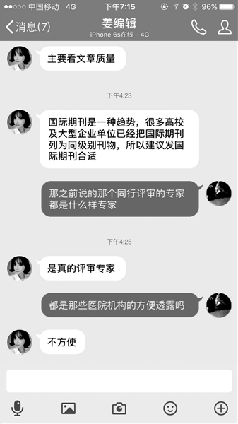 隨後,這名編輯向北青報記者提供了包括《護理學雜志》、《現代腫瘤研究進程》、《臨床研究》等18家國外期刊的名稱,並把這些雜志按照“國際期刊比較好過的”、“有點困難的”、“對文章要求相當高的”三個標準進行分類。北青報記者隨機選擇了“通過有點困難”的一個雜志,詢問能否代發醫學類論文,這名編輯承諾交了錢需要半年左右才能夠發表。