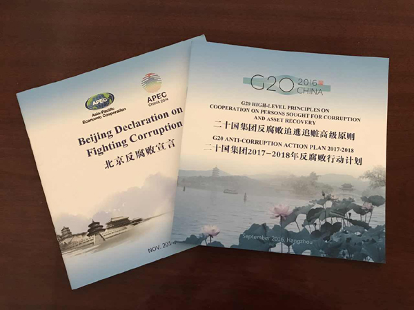 APEC《北京反腐敗宣言》、《二十國集團反腐敗追逃追贓高級原則》和《二十國集團2017至2018年行動計劃》。