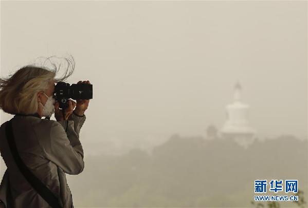 5月4日,在北京景山公園的萬春亭,一名外國遊客戴著口罩拍照。當日,北京遭遇沙塵天氣,北京市氣象臺發布沙塵暴藍色預警。 新華社記者 沈伯韓 攝