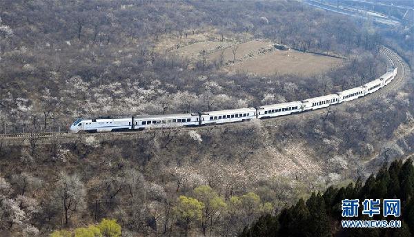 3月28日,一列火車在北京居庸關附近的山花中穿行。 新華社記者 陳曄華 攝