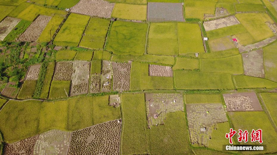 8月17日,初秋時節,地處金沙江幹熱河谷的雲南牟定縣羊舊村水稻成熟,金黃的大地描繪出一幅豐收的畫卷。中新社記者 劉冉陽 攝