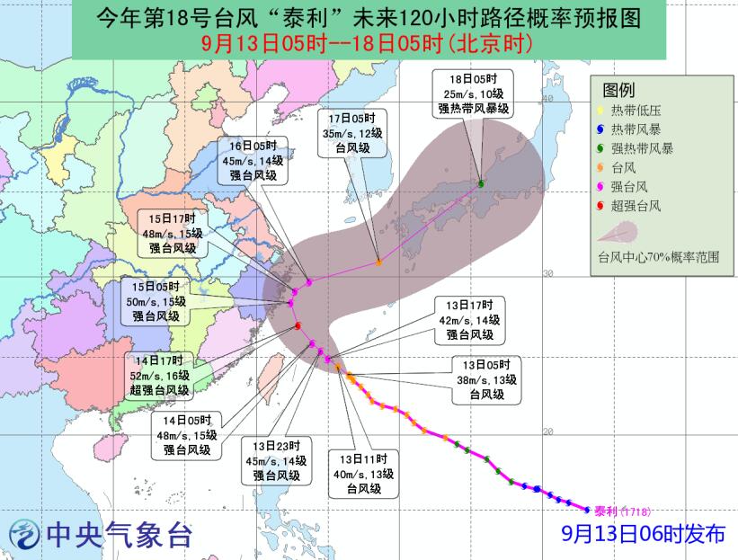 預計,“泰利”將以每小時20公裏左右的速度向西北方向移動,強度繼續加強,最強可達強臺風級或超強臺風級(14-16級,45-52米/秒),將于今天白天進入東海東南部,逐漸向浙江沿海靠近,可能于14日夜間到15日上午在浙江中北部一帶沿海登陸(臺風級或強臺風級13-15級,40-48米/秒);也有可能于15日白天在浙江近海北上,然後轉向東北方向移去。